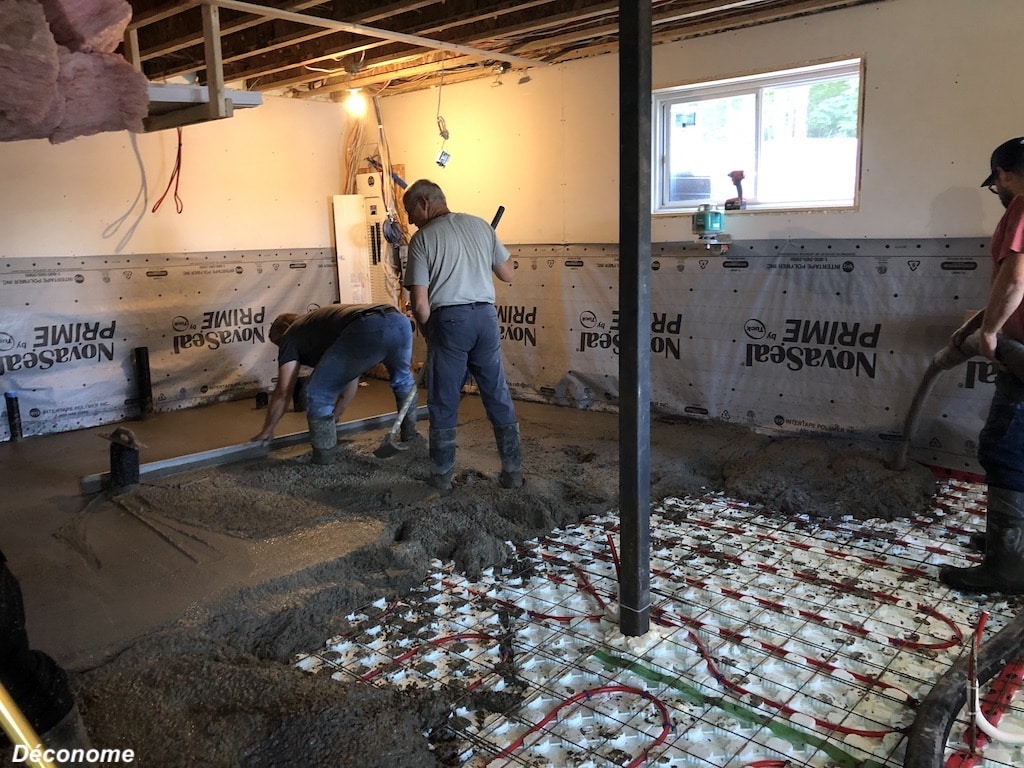 Dans un sous-sol qui devient très froid en hiver, la dalle de béton hydronique est donc une solution de chauffage idéale, super agréable, qui concentre la chaleur vers le sol. Sans bruit de convecteurs, sans poussière déplacée par des plinthes et surtout sans plinthe apparente au mur. Cela peut donner un très beau résultat si le poseur de dalle s’y connait en dalles apparentes (lire plus bas).