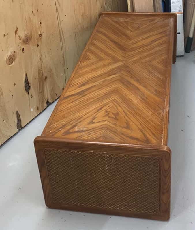 - Poncer la table pour la remettre au bois naturel et enlever les côtés abîmés, ici le rotin