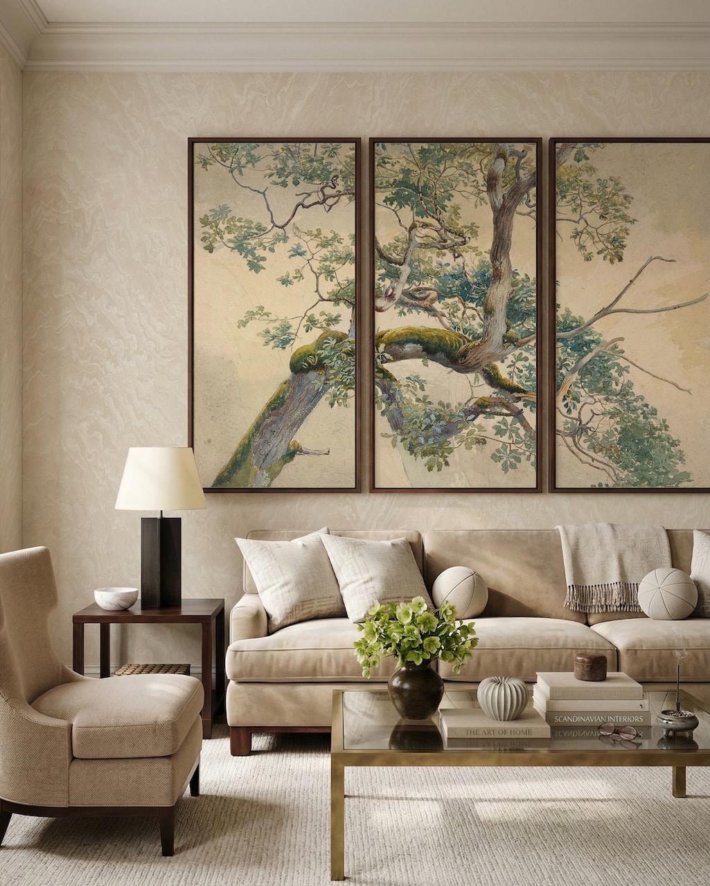 - Un triptyque : trois panneaux qui guident le regard et créent un effet panoramique, presque cinématographique.